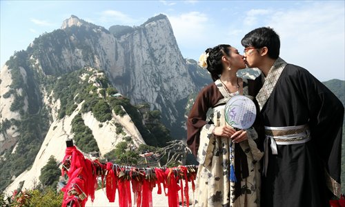 A couple celebrating the Qixi Festival in traditional hanfu. Photo: CFP